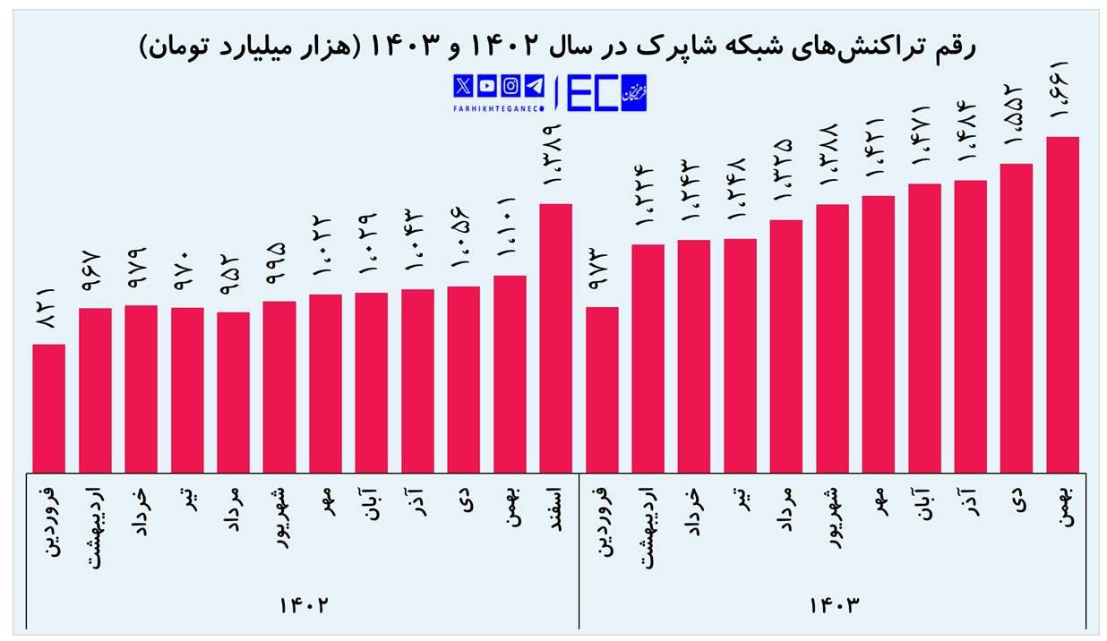 به گزارش بانک مردم و به نقل از فرهیختگان اقتصادی؛ دادههای بانک مرکزی ایران نشان میدهد در بهمنماه ارزش تراکنشهای شبکه شاپرک به ۱۶۶۱ همت رسیده که نسبت به دیماه رشد ۷ درصدی و نسبت به بهمنماه ۱۴۰۲ رشد ۵۱ درصدی داشته است.