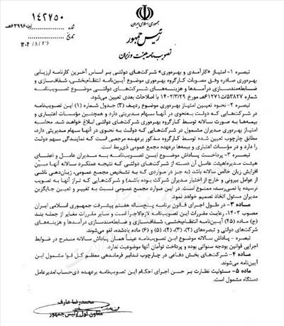 به گزارش بانک مردم و به نقل از تسنیم، تصویبنامه مصوب هیات وزیران درخصوص «چارچوب پاداش سالانه قابل پرداخت به مدیرعامل، اعضای هیات مدیره، اعضای هیات عامل و مدیران شرکت های دولتی و شرکت هایی که دولت به نحوی در آنها سهام مدیریتی یا کنترلی دارد، موسسات اعتباری و بیمه ها» با شماره 142750 در تاریخ 1404/08/26 توسط معاون اول رییس جمهور ابلاغ شد.