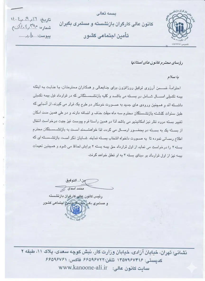 پایگاه خبری تحلیلی بانک مردم: کانون عالی بازنشستگان تأمین اجتماعی اعلام کرد بازنشستگان میتوانند بسته بیمه تکمیلی خود را بهدلخواه انتخاب یا تغییر دهند و در صورت ارتقا از بسته یک به بسته دو، تعهدات بیمهای آنان از ابتدای قرارداد بر اساس بسته جدید محاسبه خواهد شد.