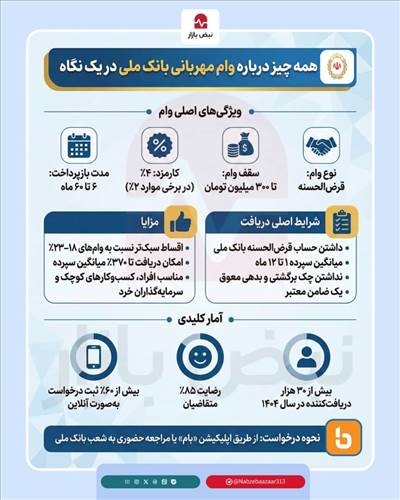 پایگاه خبری تحلیلی بانک مردم: وام مهربانی بانک ملی با نرخ کارمزد پایین، شرایط سادهتر و بازپرداخت بلندمدت، به یکی از پرطرفدارترین تسهیلات قرضالحسنه کشور تبدیل شده و امکان دریافت وام تا ۳۷۰ درصد میانگین سپرده را برای متقاضیان فراهم میکند.