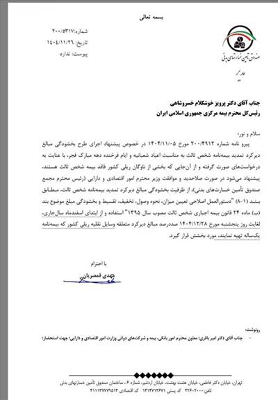 بر اساس محتوای این مکاتبه، صندوق تأمین خسارتهای بدنی با استناد به بند «ب» ماده 24 قانون بیمه اجباری شخص ثالث مصوب سال 1395 و دستورالعملهای مربوط به نحوه وصول، تقسیط، تخفیف و بخشودگی جرائم، اعلام کرده است که امکان اعمال بخشودگی جرائم دیرکرد بیمهنامههای شخص ثالث وسایل نقلیه ریلی وجود دارد؛ موضوعی که اجرای آن منوط به موافقت وزیر امور اقتصادی و دارایی و تصمیم نهایی بیمه مرکزی خواهد بود.